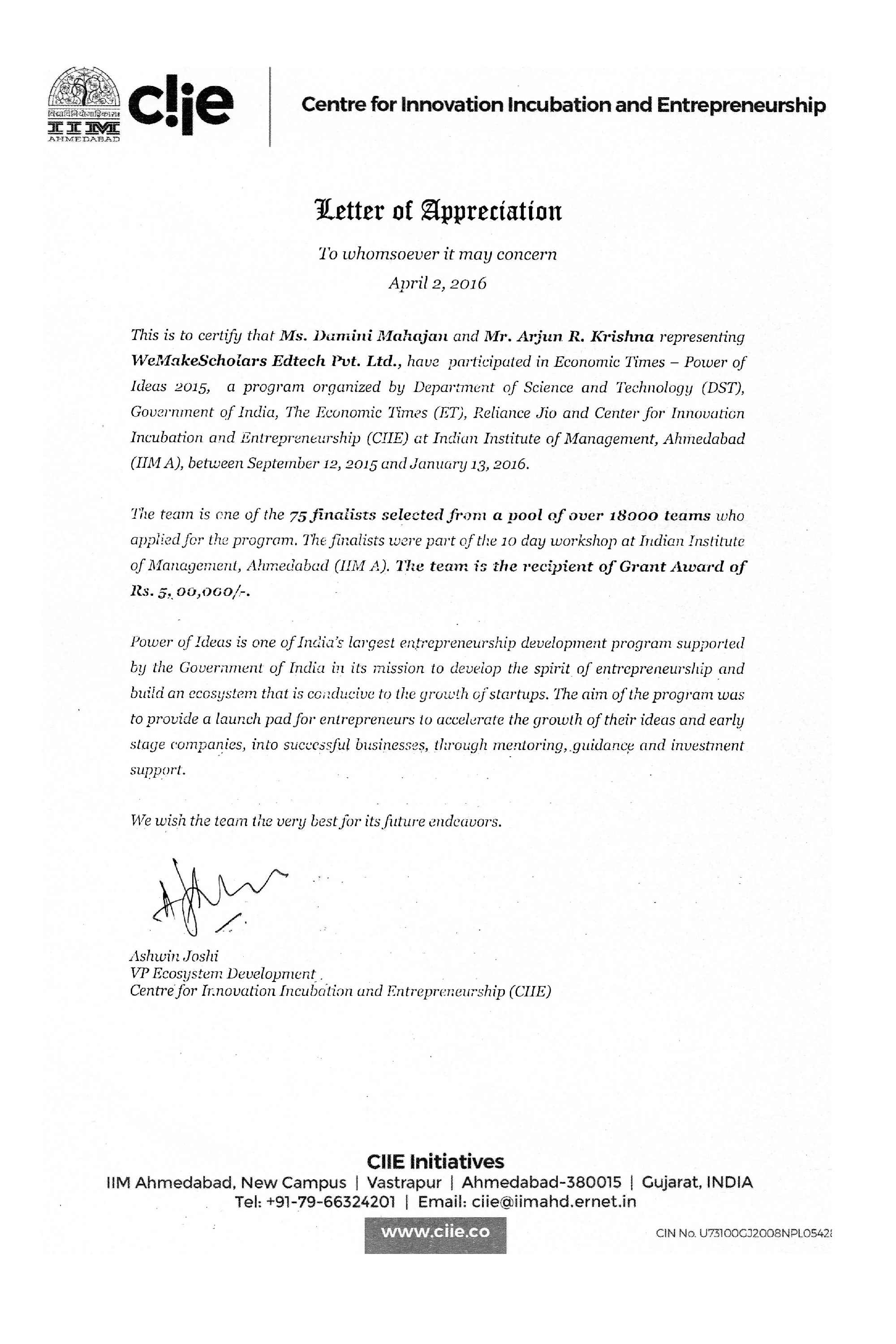 WeMakeScholars was recognised as the top 40 startups in India by ET Power of Ideas and IIM Ahmedabad in 2016 for its innovation in education financing